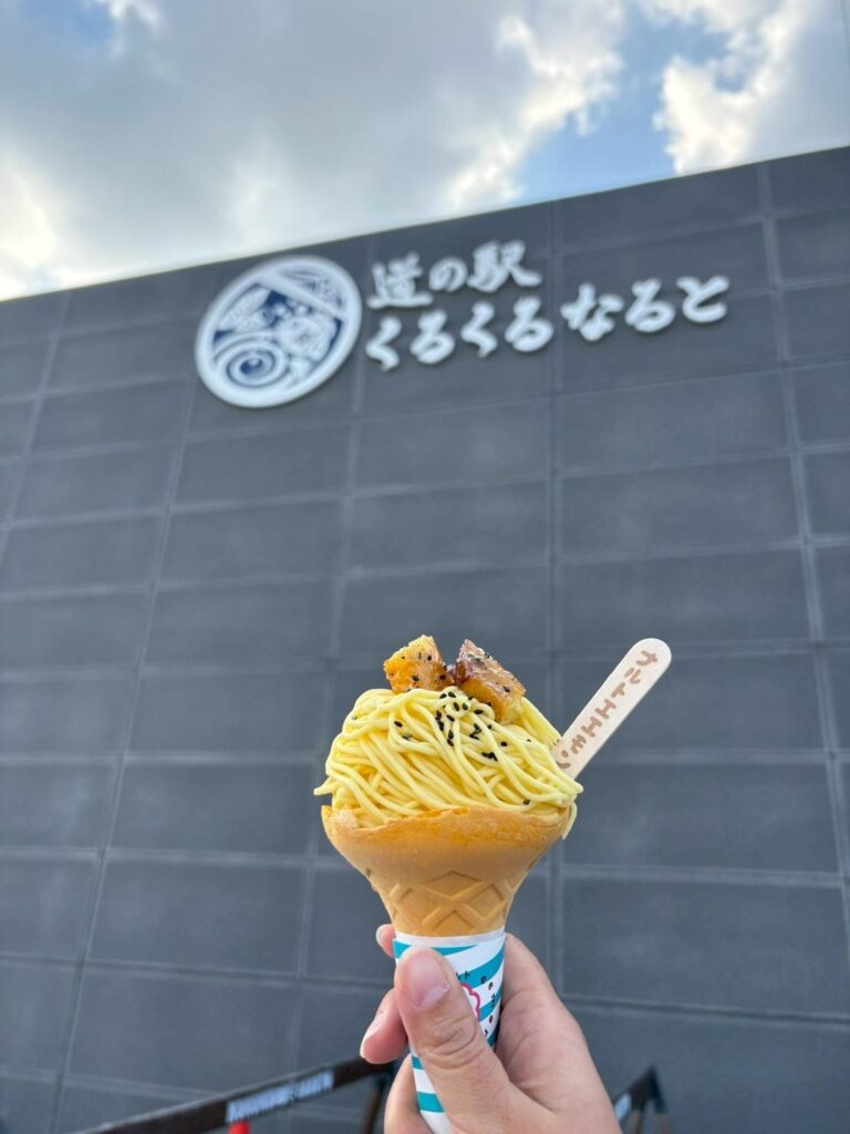 鳴門の名物「渦潮」をイメージした渦巻き状のソフトクリームで、鳴門金時の風味がしっかり感じられる濃厚な味わいなんです。