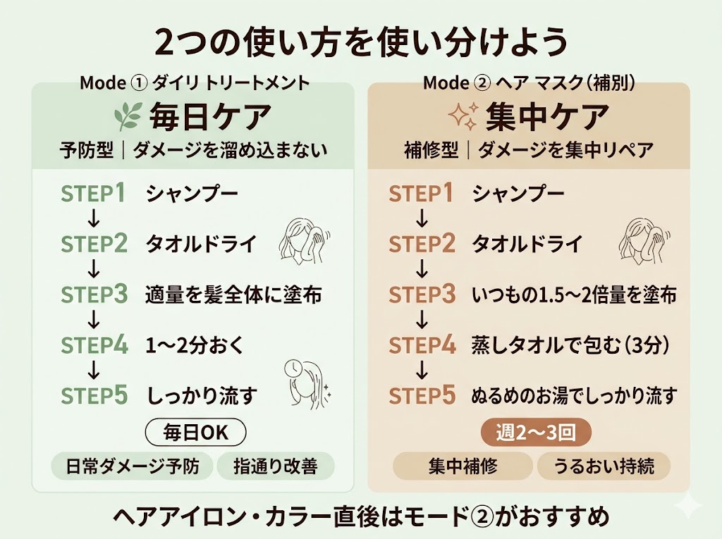 - 使い方は2通り——デイリートリートメントとして毎日使うか、週2〜3回のヘアマスクモードで集中ケアするか