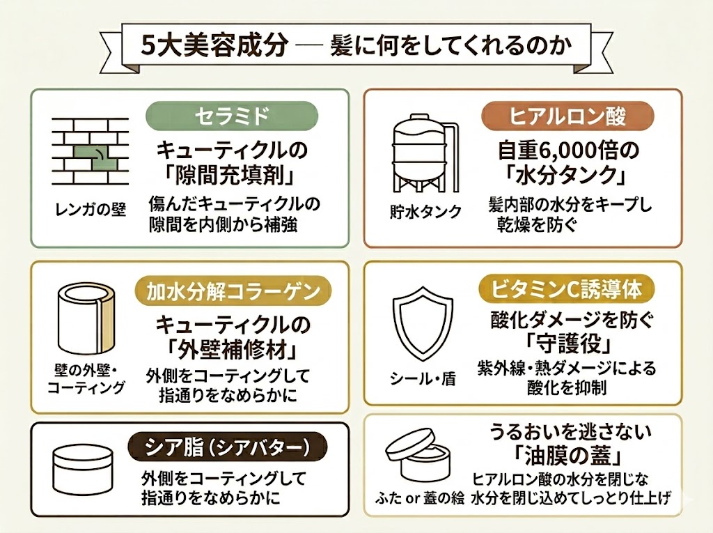 この記事では、競合記事があまり触れていない12種美容成分の個別の役割と、「トリートメントとして使うか、ヘアマスクとして使うか」という使い方フレームワークにフォーカスします。あなたの髪質に合った使い方もわかるようになっているので、ぜひ最後まで読んでみてください。