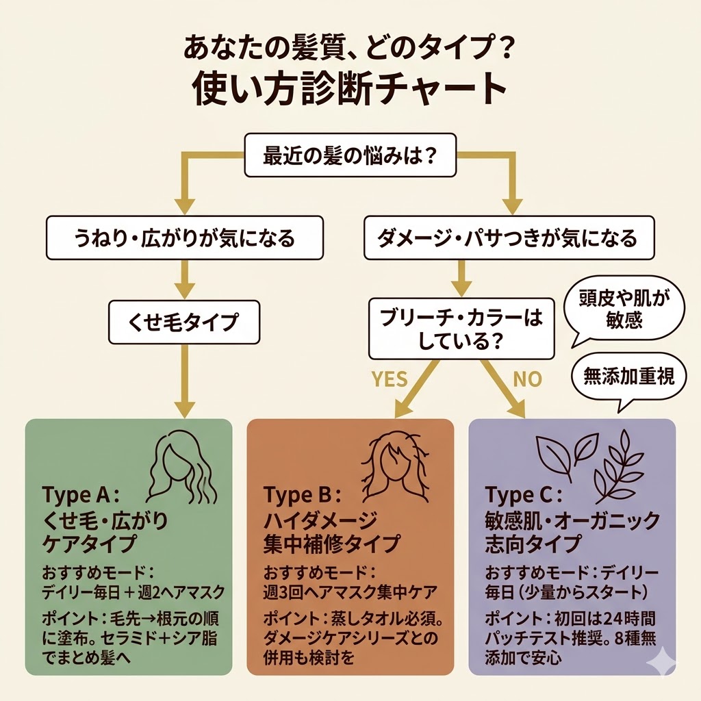「オーガニック系って自分の髪には合うのかな?」という疑問、よくわかります。実は髪質によって使い方が変わるので、3パターンに分けて考えてみましょう。