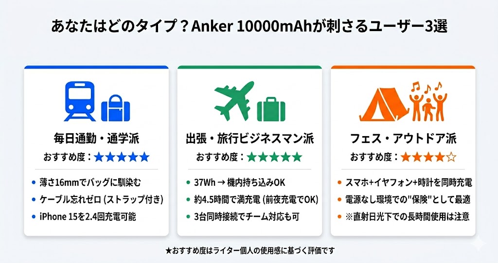 結局のところ、Anker Power Bank (10000mAh, 22.5W) が多くの人に選ばれる理由は「尖った機能は持たないが、普通の使い方をする限り裏切らない」という安定感にあります。