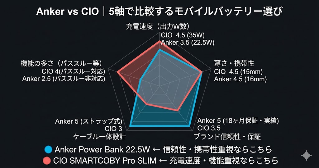 | 比較軸 | Anker Power Bank 22.5W | CIO SMARTCOBY Pro SLIM |