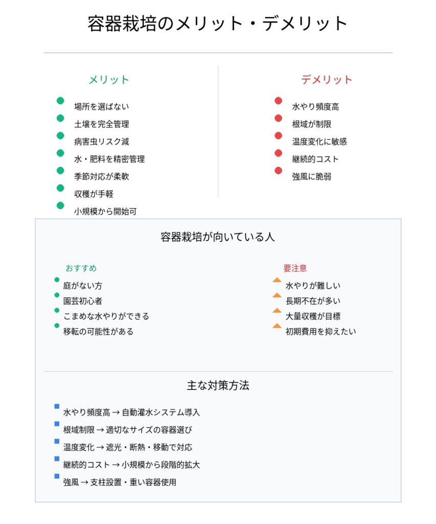 容器栽培は、限られたスペースでも豊かな園芸体験を提供してくれる素晴らしい方法です。デメリットもありますが、適切な知識と管理で克服できるものばかりです。