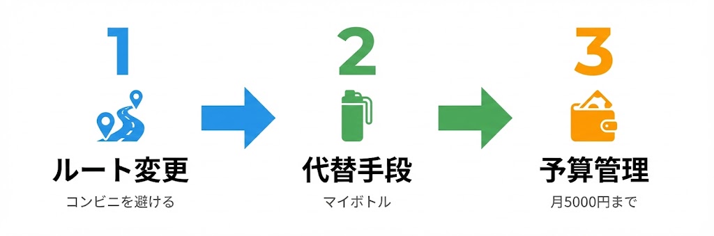 通勤ルートを少し変えて、コンビニが視界に入らない道を通る。これだけで、「ついでに寄ろうかな」という誘惑を断ち切れます。