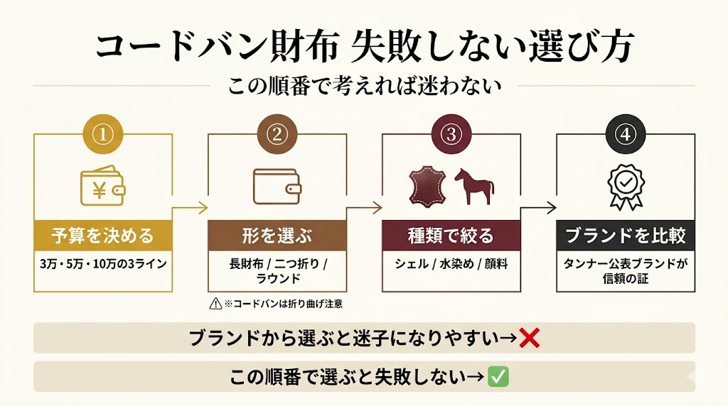 コードバン財布の選び方には「正しい順番」があります。ブランドから探すと迷子になりがちなので、まずこの流れで整理しましょう。