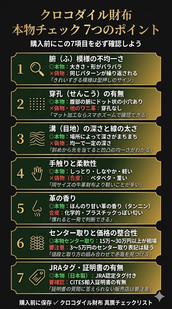 これは偽物を見分けるというより、クロコダイル財布の質を判断するポイントです。ただ、この知識があると「なぜこの値段なのか」も見えてきます。