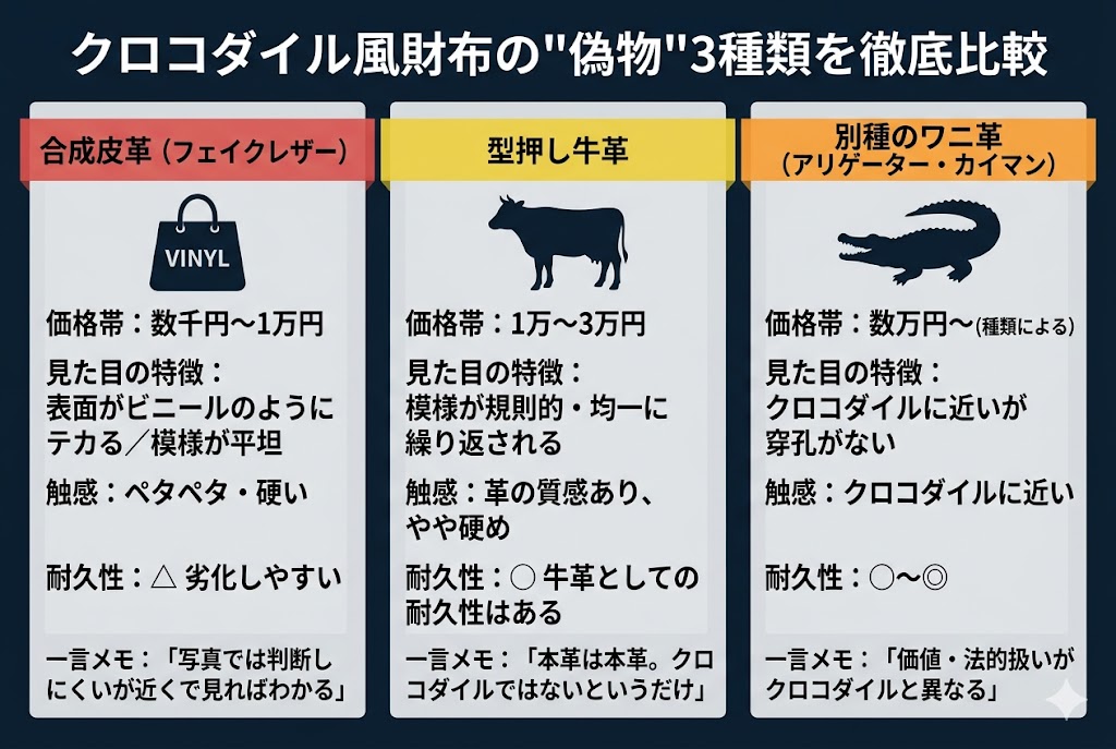- 本物クロコダイル・型押し牛革・合皮の3種類の違い