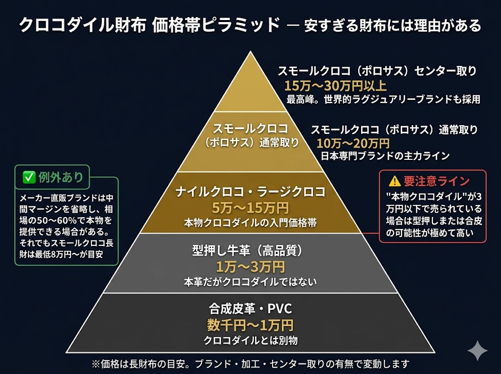 クロコダイルレザーの財布は、スモールクロコ(ポロサス)のセンター取りなら10〜20万円以上、ナイルクロコでも5〜15万円が相場です。一方、型押し牛革は1〜3万円、合皮なら数千円〜1万円程度。これだけ価格差があるのに、見た目では本当に判断しにくくなっているんですよね、最近は特に。