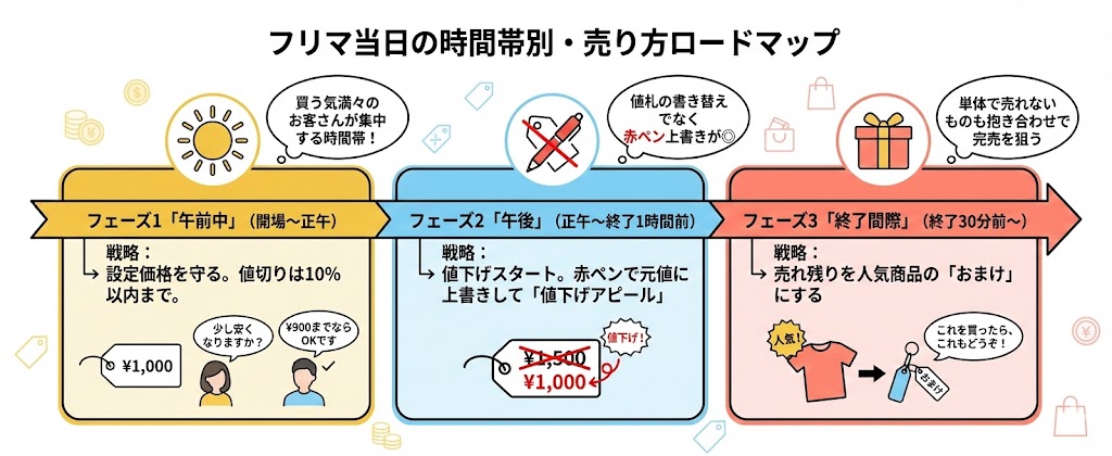 午前中(開場〜正午) はお客さんが最も多い時間帯。購買意欲も高いので、この時間は設定価格を守ることが基本です。開場と同時に目当ての商品を探しに来るお客さんもいるので、早い時間帯に値切りに応じすぎると「あの店は値切れる」という印象がついて、終日やたらと交渉されることになりかねません。