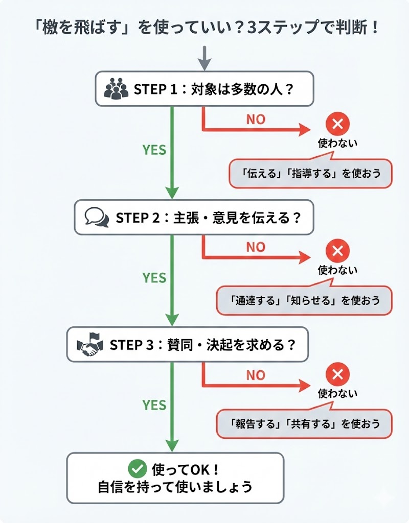 この3つすべてに当てはまれば、「檄を飛ばす」を使ってOKです。一つでも当てはまらなければ、別の表現を選んだ方が安全ですよ。