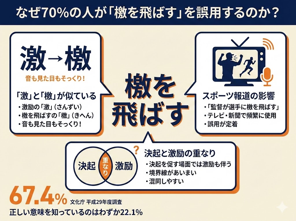 文化庁の調査によると、なんと約70%の人が「檄を飛ばす」を誤用しているんです。あなたも、もしかしたら間違えているかもしれません。