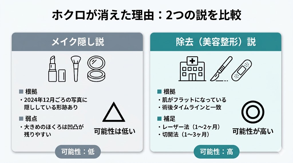 これが一番気になるところじゃないですか。「コンシーラーで隠してるだけ説」と「美容整形で取った説」、両方の可能性を検証します。