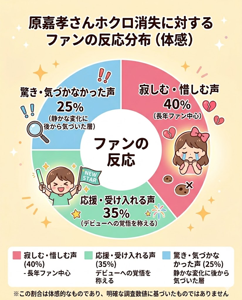 「チャームポイントだったのに」「ほくろ好きだったから取ったのは意外」という声が多かったです。長年のファンほど、この反応が多い印象でした。思い入れがある分、変化に戸惑うのは当然なんですよね。