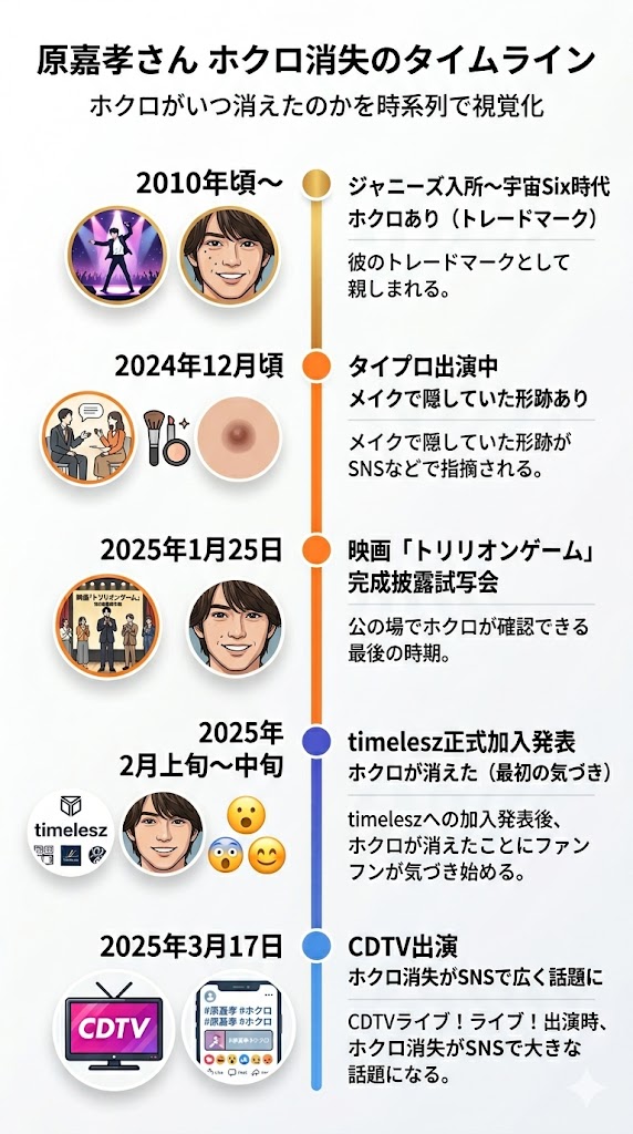 2025年3月のCDTV出演後、SNSでそんな声があっという間に広がりました。右頬の大きめのほくろが、timeleszとしてデビューを迎えた原嘉孝さんの顔から、静かに消えていたんですね。