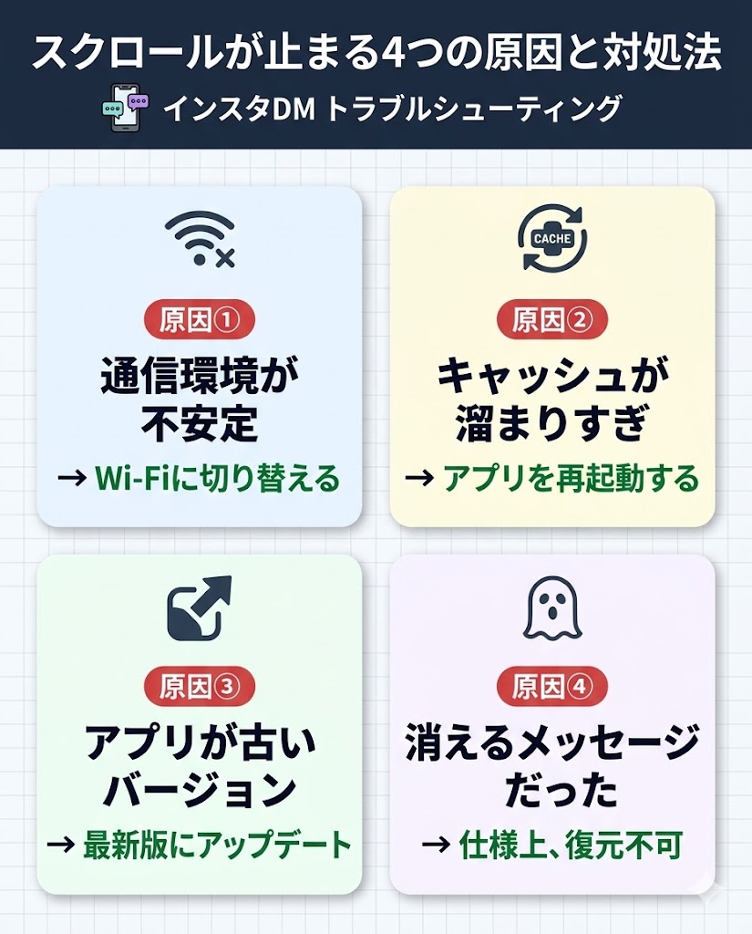 インスタのDMはスクロールのたびにサーバーから新しいデータを取得します。通信が弱いと読み込みが追いつかず、止まったように見えることがあります。
