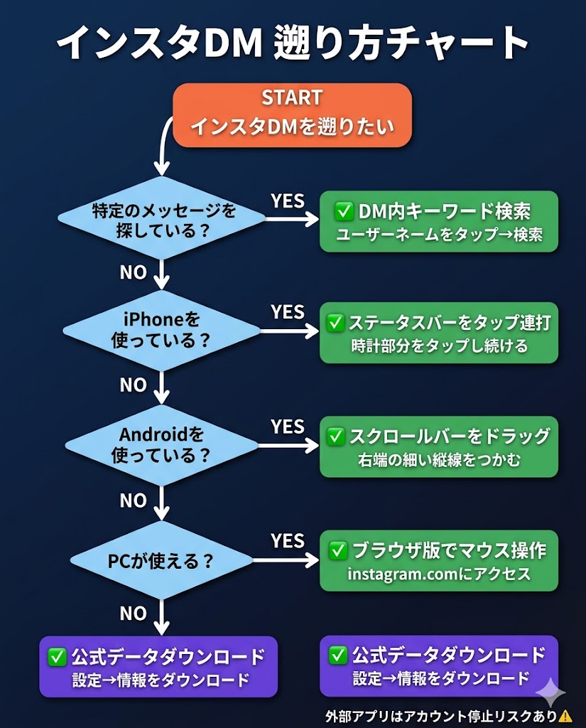 インスタDMを一番上まで遡る方法をまとめると:
