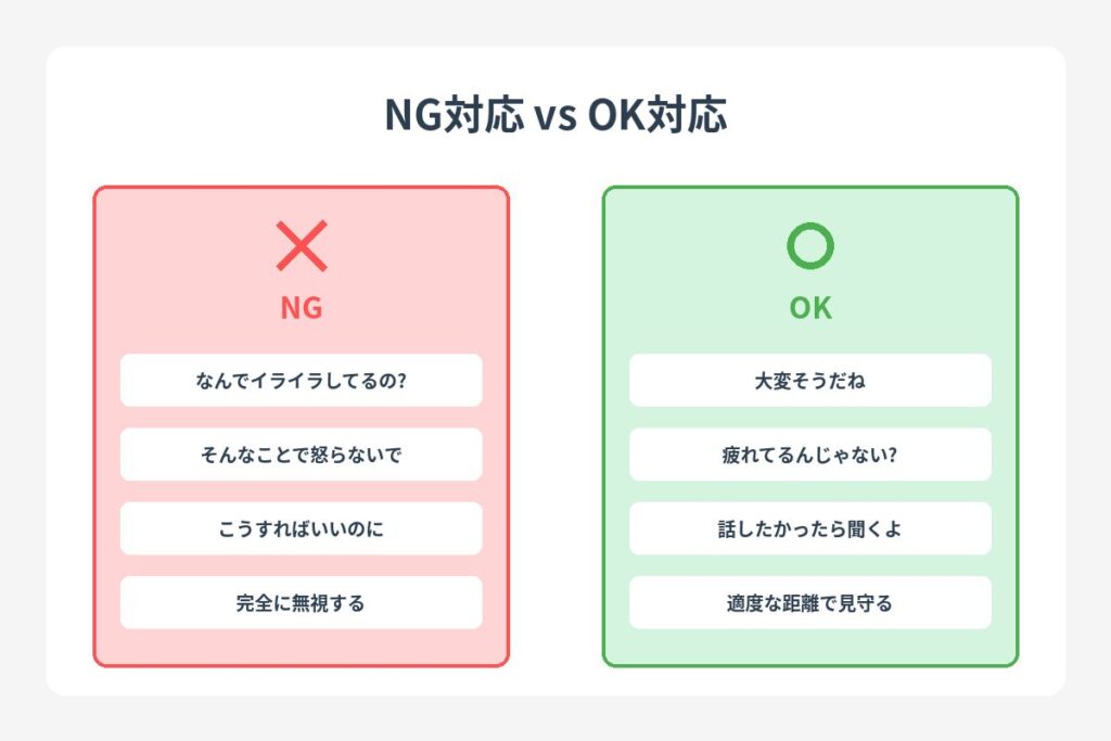 | 家族・パートナー | 話を聞く姿勢を示す | 様子を見守り、落ち着いたら声をかける | 一時的に距離を置き、後で話し合う |