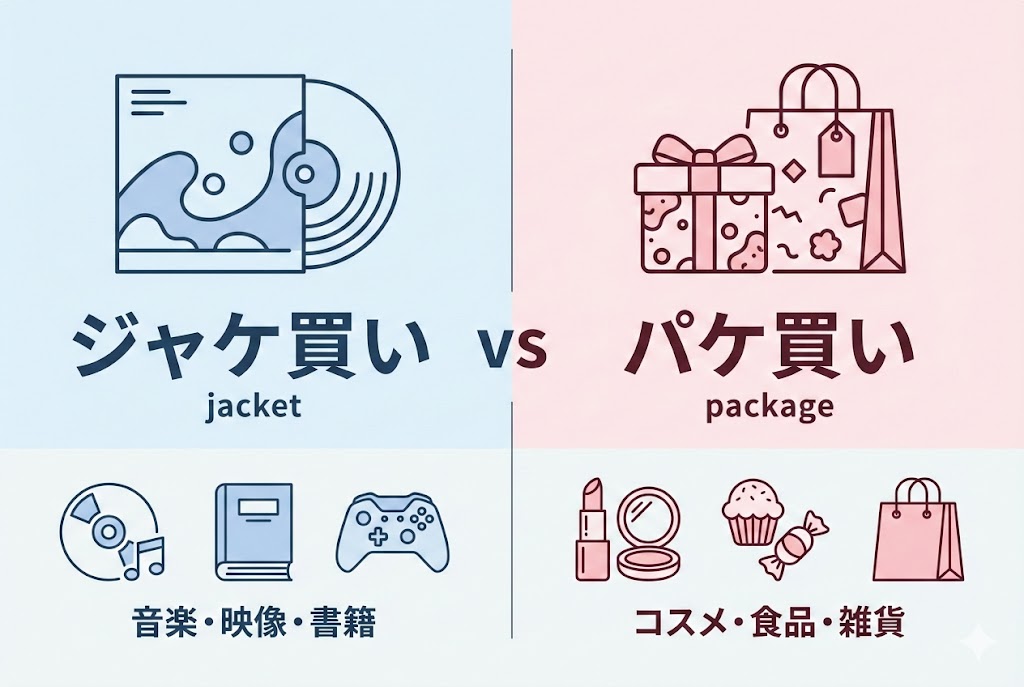 個人的には、**音楽や映画の話題と一緒に語るなら「ジャケ買い」、それ以外なら「パケ買い」**という使い分けがしっくりきますね。