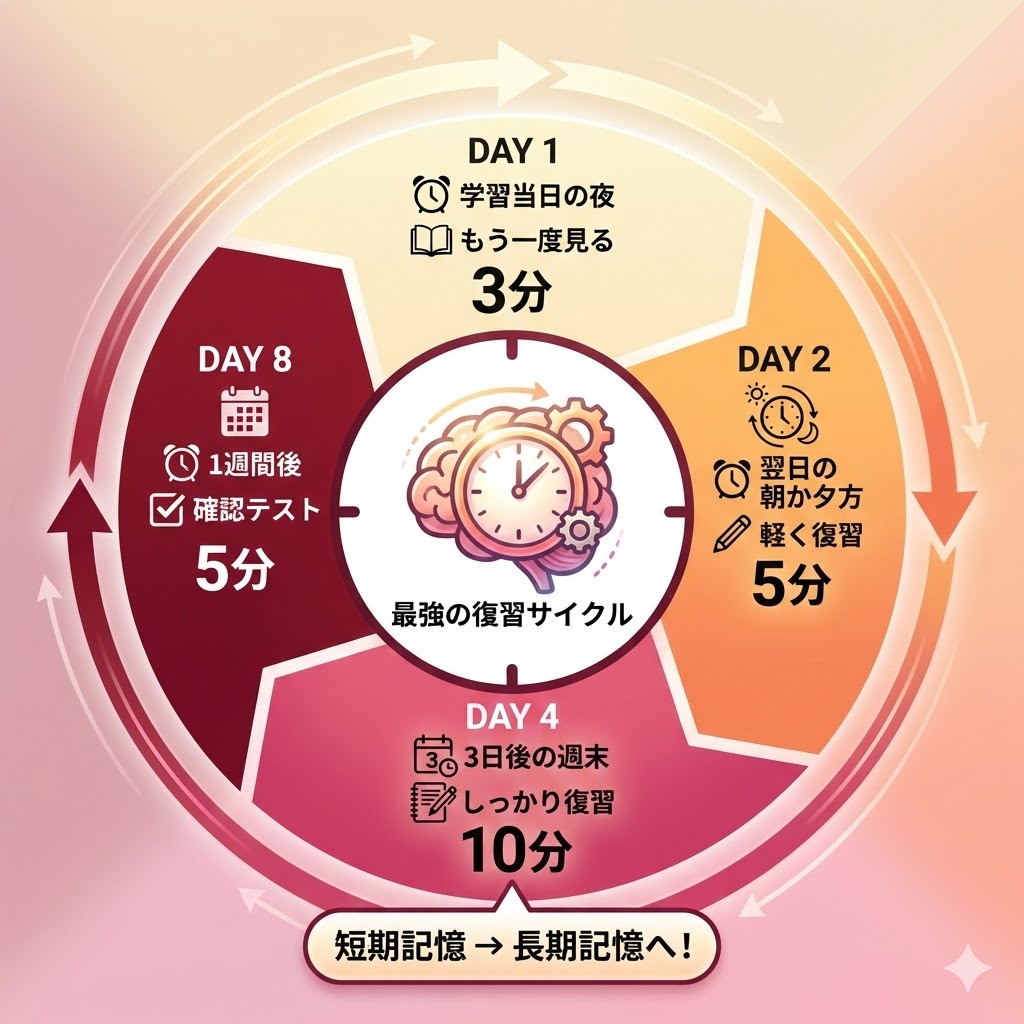 解決策は、復習のタイミングを工夫することです。覚えた翌日、3日後、1週間後と、間隔を空けて復習することで、長期記憶に定着しやすくなりますよ。