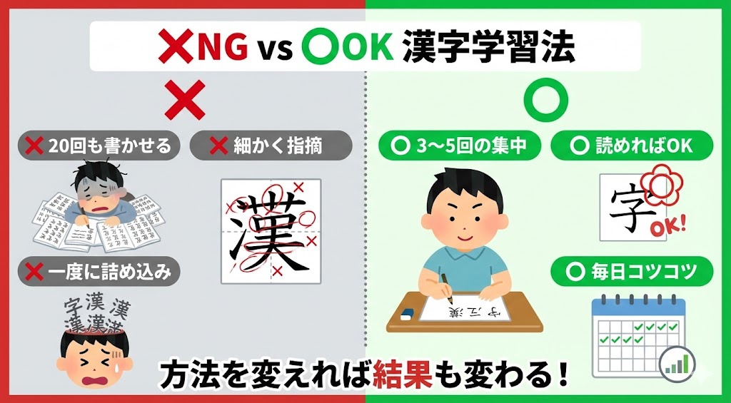 つまり、「ひたすら書く」という一つの方法だけでは、すべての子どもに合うわけではないんですね。お子さんに合った覚え方を見つけることが、漢字学習成功の第一歩になります。