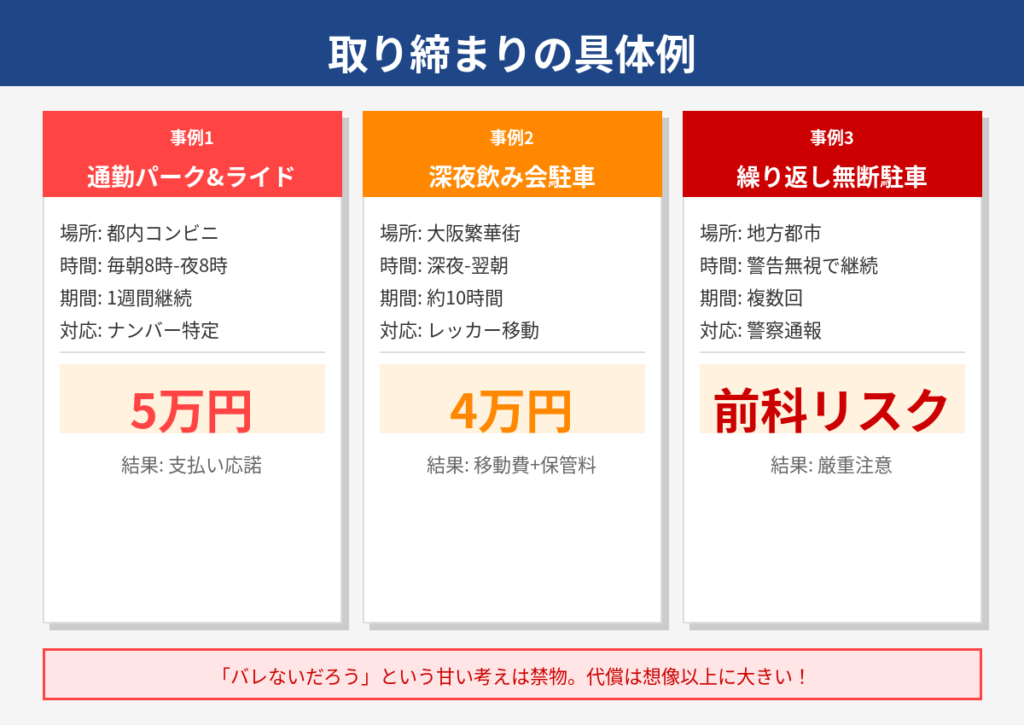 無断駐車の取り締まり具体例をいくつかご紹介します。