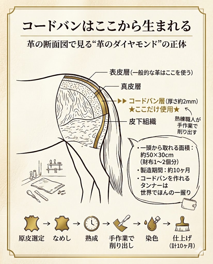 コードバンは、農耕馬のお尻部分からしか取れない革です。一般的な革は皮の表面を使いますが、コードバンはその内部に存在する「コードバン層」と呼ばれる、厚さわずか2mm程度の繊維層だけを職人が丁寧に削り出して作られます。この削り出し作業が、まるで宝石の採掘に似ているということで「革のダイヤモンド」「革の宝石」と呼ばれるようになったわけです。