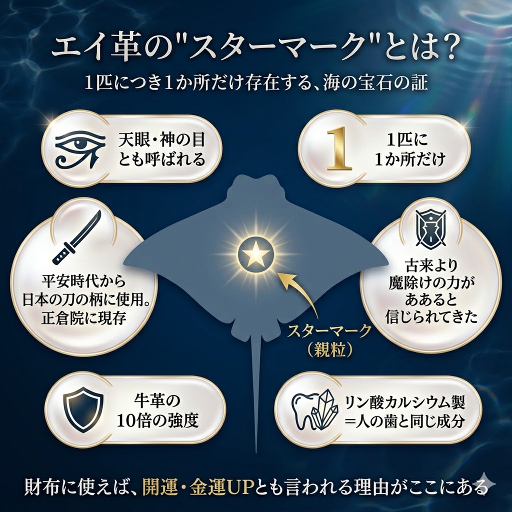 エイ革の背中の中心部には、少し大きな突起が集まった白い部分があります。これが「スターマーク」(スティングレイハート)と呼ばれ、1匹につき1か所しかありません。古来より「天眼」「神の目」と崇められ、財布のデザインではこの部分を正面に配置するスタイルが人気です。
