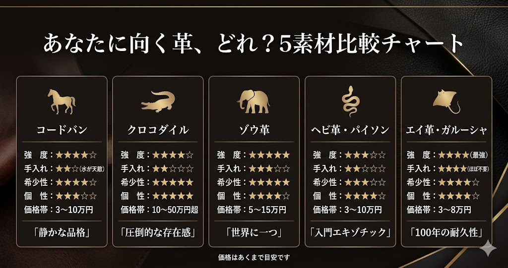 ゾウ、ヘビ、エイ、クロコダイル、コードバン。5つの素材を見てきましたが、最終的にどれを選ぶかは「スペック」よりも「自分がどんな存在でありたいか」に近い問いかもしれません。