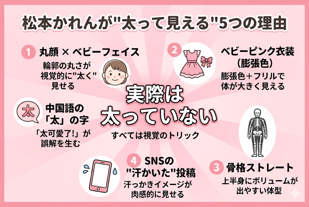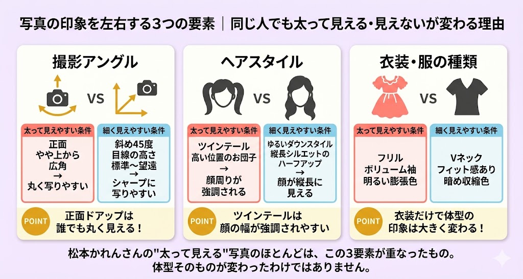 - 「太って見える」のは丸顔・膨張色・骨格・衣装デザインなど複数の視覚的要因が重なっているため