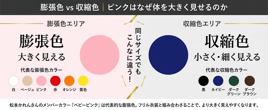 松本かれんさんのメンバーカラーは「ベビーピンク」。ピンクは代表的な膨張色で、実際の体積よりも大きく見えやすい色とされています。さらにFRUITS ZIPPERの衣装は、フリルやリボンをふんだんに使ったガーリーデザイン。ふわっと広がるシルエットが加わることで、体型が実物より丸く見えやすくなります。
