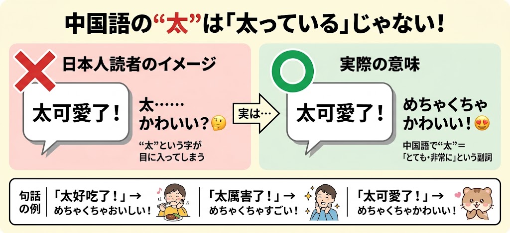 中国語で「太」という字は「とても」「非常に」という意味の副詞として使われます。中国語圏のファンが「太可愛了!(めちゃくちゃかわいい!)」とコメントすると、日本語の感覚では「太……かわいい?」と読んでしまい、「太」の字が目に飛び込んでくるわけです。