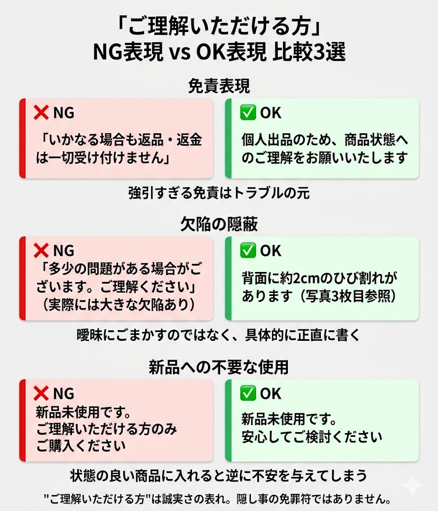 「ご理解いただける方」は、隠し事の免罪符ではありません。欠陥をわざと曖昧にして責任を回避しようとする使い方は、メルカリ規約違反になる可能性もありますし、何より誠実じゃない。結局クレームになります。