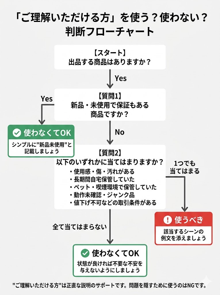 新品商品に「ご理解いただける方」を入れてしまった経験、私も一度あります。お気に入りの文具セットを出品した時、なんとなく習慣で末尾に添えてしまって…後から見返したら、まるで「何か問題ある商品です」って言ってるみたいで、自分でも苦笑いでした。