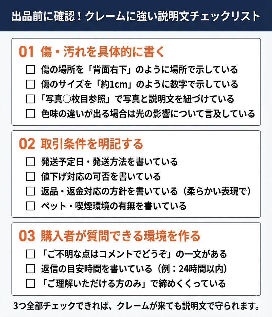 完全にトラブルがなくなるわけではありませんが、万が一クレームが来た時に「説明文に記載していました」と主張できる”証拠”にもなります。これ、地味にすごく大事なポイントなんですよ。