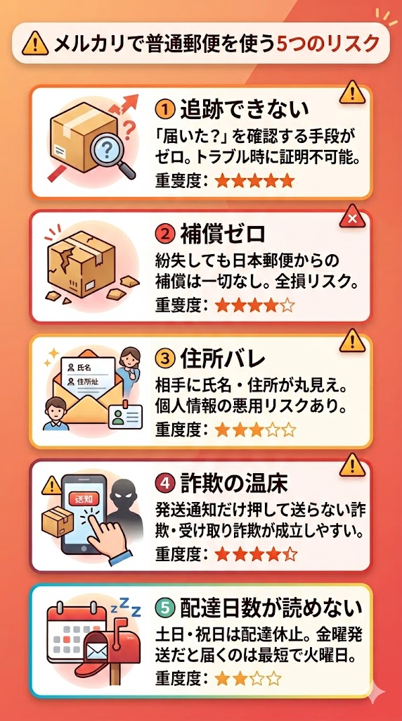 普通郵便には追跡がないため、悪意ある出品者が**「発送通知だけ押して実際には送らない」詐欺**が成立してしまいます。