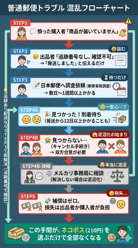 メルカリ事務局も、追跡記録がない場合は「調査できません」と返すことが多く、最終的には出品者と購入者の二者間で話し合いをして——というか、泥沼になって——解決することになります。実際に3,000円のアクセサリーを普通郵便で送って「届いていない」と言われ、証拠もないまま全額返金した出品者の話をフリマコミュニティで何度も見てきました。「なんで私が全額負担するの」という怒りはもっともですが、証明できない以上どうにもならないんです。