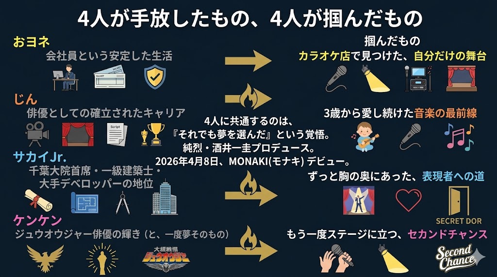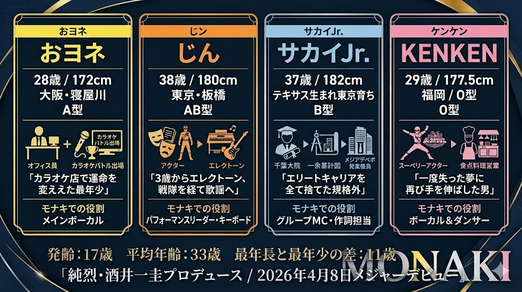 この記事では、モナキのメンバー4人のプロフィールと経歴を、競合記事では掘り下げられていない「なぜ今のキャリアを捨てて夢を選んだのか」という視点も含めて徹底解説します。