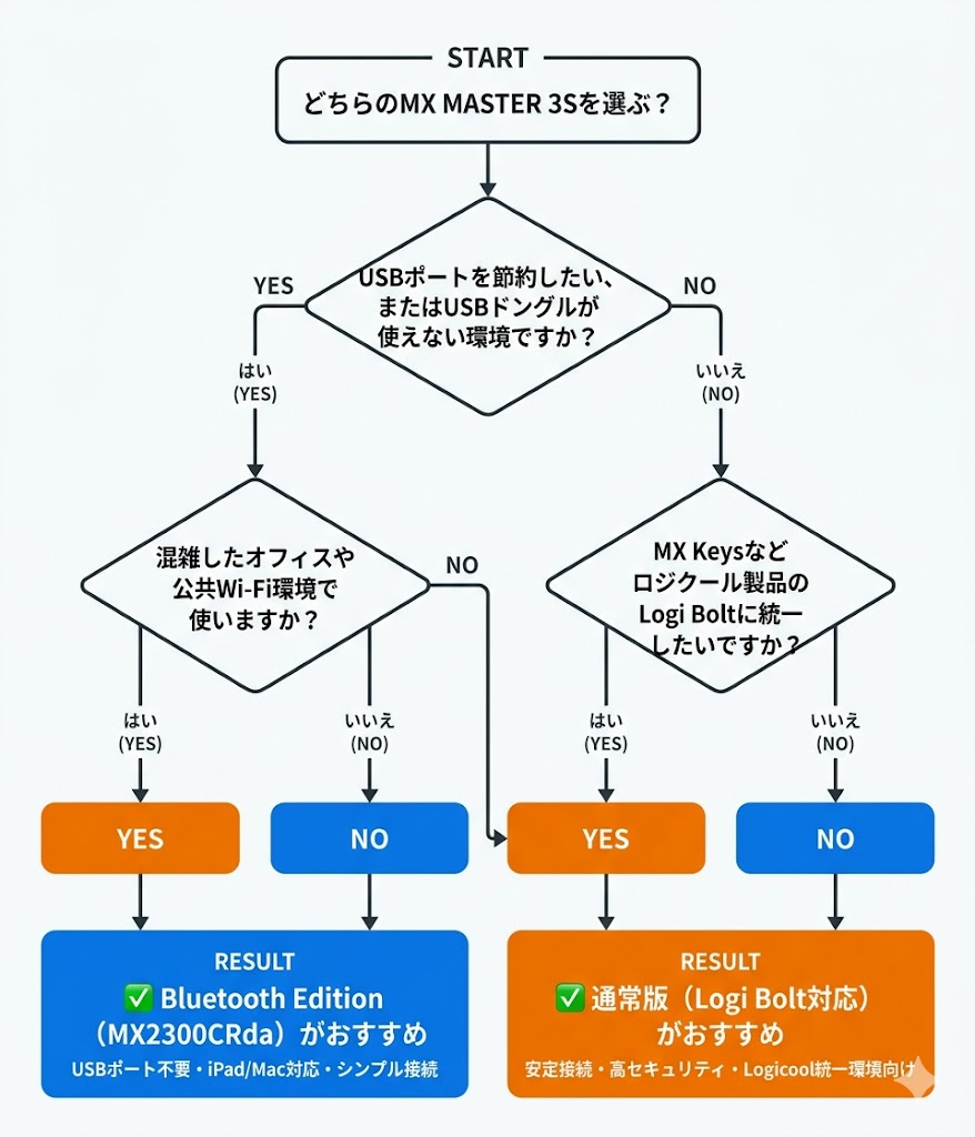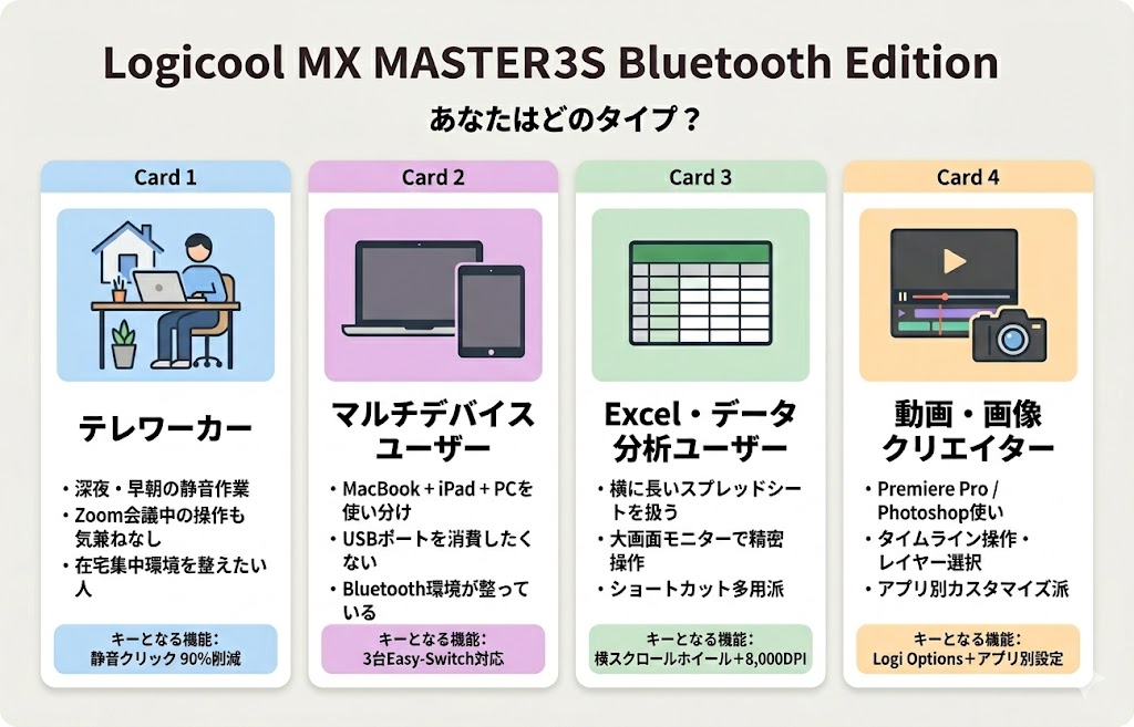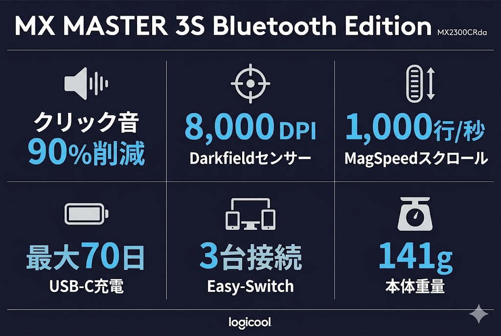 MX MASTER 3S Bluetooth Editionは、「Bluetoothだけで十分」というユーザーに向けた賢い選択肢です。