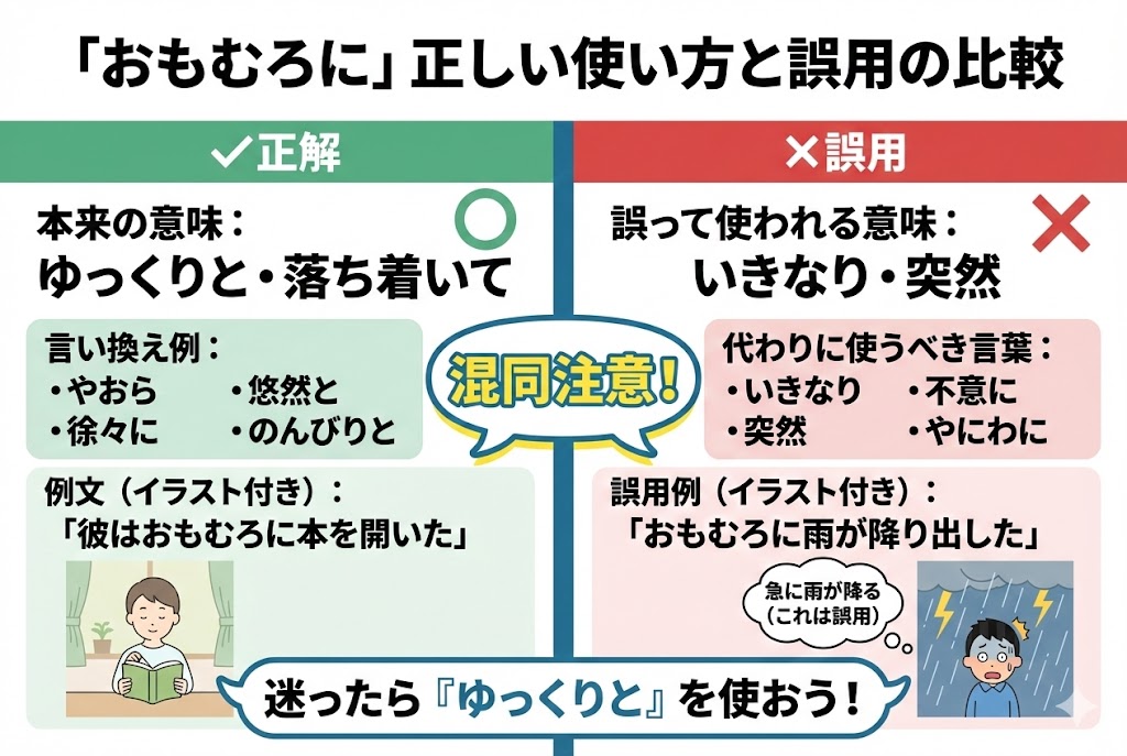誤用では、「おもむろに」が**「いきなり」「突然」「不意に」**という意味で使われています。