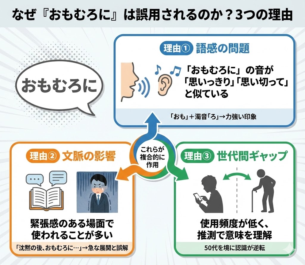 「おもむろに」の場合、文学作品や堅い文章で使われることが多く、日常会話ではあまり使われない言葉でした。そのため、実際の使用例に触れる機会が少なかった若い世代が、推測で意味を理解しようとした結果、誤解が広がったと考えられます。