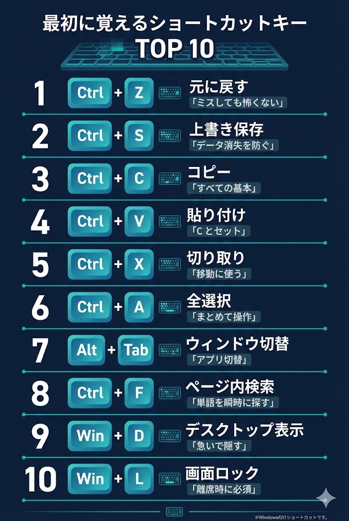 この記事では、ただのショートカットキー一覧ではなく、「どの順番で覚えると効果が大きいか」「なぜそのキーの組み合わせなのか」まで踏み込んで解説していきます。