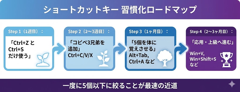 脳科学の観点からも、一度に短期記憶に入れられる情報は5〜7個程度とされています。まずCtrl + ZCtrl + Sの2つを1週間使い倒してから次の2つに進む、というやり方の方が確実に身につくんですね。