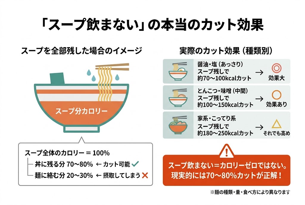 - 麺に絡む分のスープは避けられない。「残した=ゼロ」ではなく「70〜80%カット」が現実的