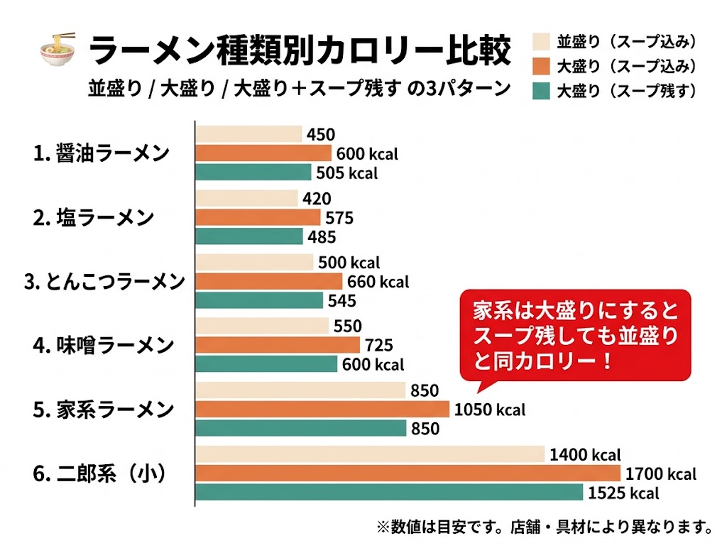 醤油・塩のあっさり系を選ぶだけで、こってり系より300〜500kcal近い差が出ます。「大盛りにしたいから種類はあっさりにする」というトレードオフ、これは賢いですよ。