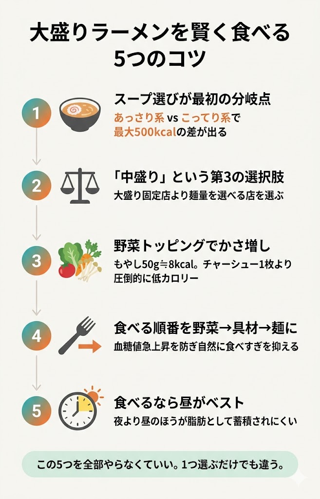 「大盛り固定」のお店より、「麺の量を選べる」お店のほうが融通が利きます。「中盛り」という選択肢があれば、並盛り+70g程度に抑えられる。私はこれで「大盛りの満足感を得ながらカロリーは並盛り+100kcalほど」に収めています。