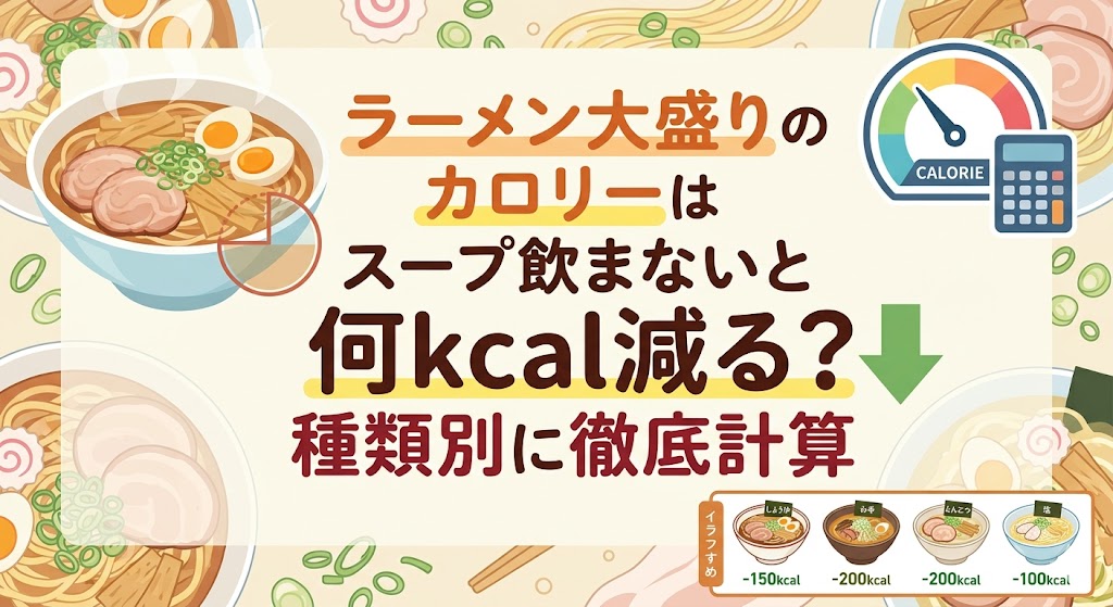 この記事では、大盛りラーメンのカロリーとスープを飲まないことで何kcal減るかを、種類別に具体的な数字で整理します。「スープ飲まない派」だからって完全に安心できるわけでもないので、そのあたりの正直な話もします。