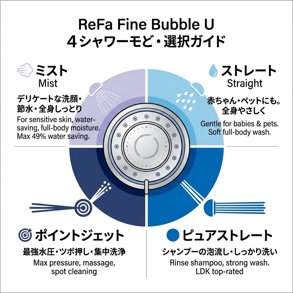 リファ ファインバブル Uの強みをひとことでまとめると——「ウルトラファインバブルとマイクロバブルの2種類が、洗浄・うるおい・節水を同時にこなせること」。そして、人間だけでなく愛犬や家族全員で使えるオールラウンドさが、この商品を単なるシャワーヘッドの枠を超えた存在にしています。
