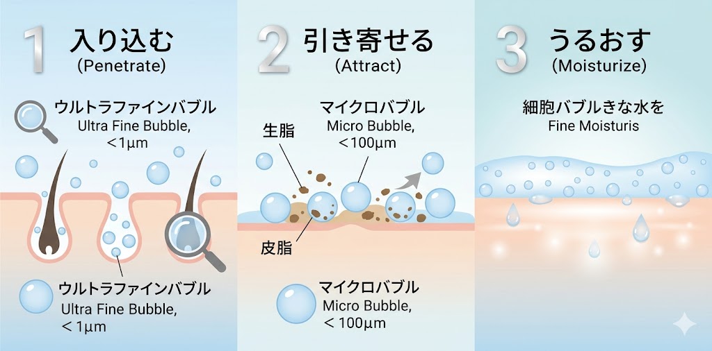 さらに、ファインバブルを含んだお湯が全身に行き渡ることで、浴びるだけで「うるおいのあるしっとりとした肌」へ導く、という3ステップのクレンズ作用が働くわけです。