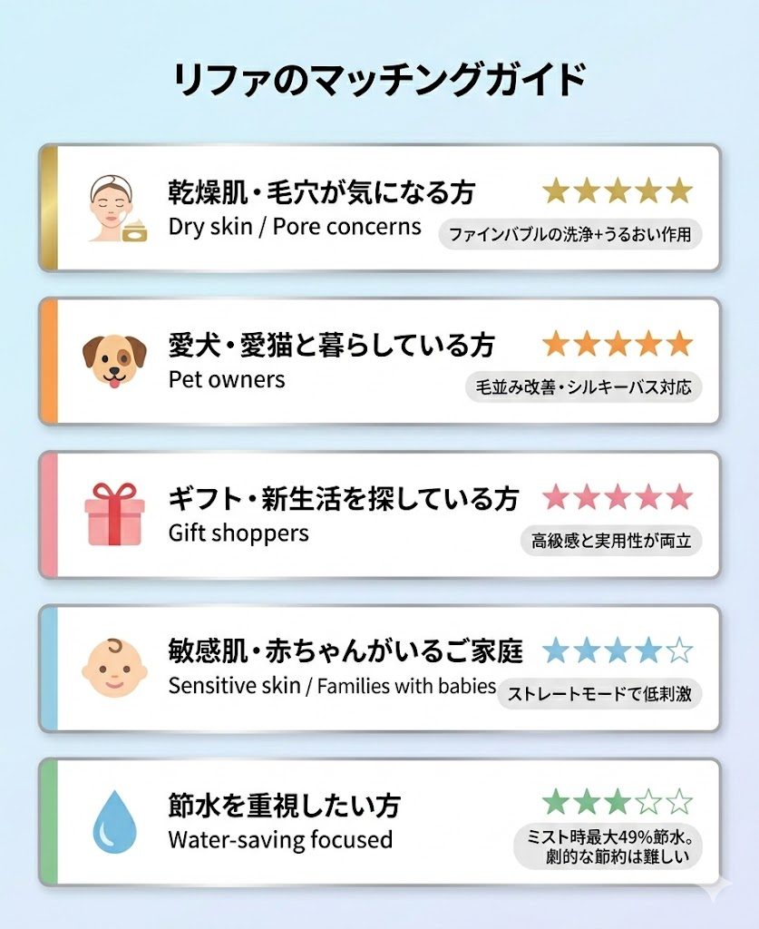 | 肌の乾燥・毛穴汚れが気になる方 | ★★★★★ | ファインバブルの洗浄+うるおい作用がダイレクトに働く |