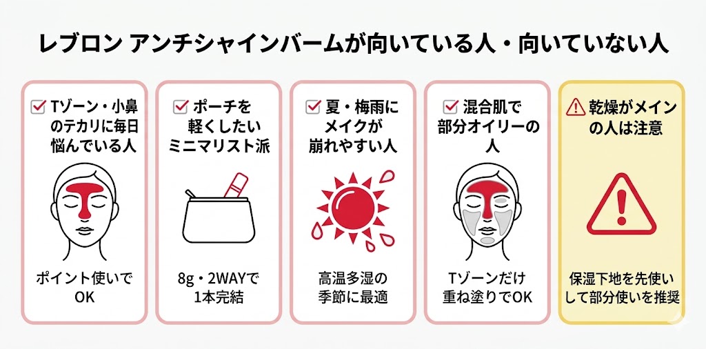 正直にいうと、テカリを押さえる下地そのものは他にも選択肢があります。でも「下地として朝使って、日中はそのままメイク直しにも使えて、ポーチに入れても邪魔にならない」という3条件をすべて満たすのが、このアンチシャインバームの強みなんですよね。